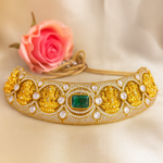 Temple Choker Necklace with Lakshmi Motifs and Green Emerald Center Stone