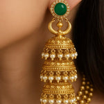 Regal Triple Dome Jhumkas with Pearls & Emerald Stud – Antique Gold Finish in Pure Silver