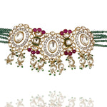 With statement polki stones set with CZ stones embracing a radiant pink & green stones, this polki choker necklace captures the colors of spring beautifully.
