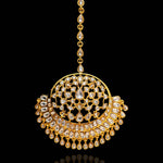 This exquisite bridal set features a regal Kundan Polki necklace adorned with bold triangular motifs, each meticulously framed by intricate gold filigree and bordered with uncut stones for timeless brilliance.