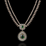 18K Gold Polished 2 Lines Diamond Look Necklace with Emerald Drop