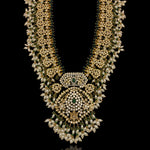 A statement piece from our new exclusive collection, this magnificent necklace boasts polki setting on gold polished silver with bunch of rice pearls all around it.