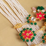 The haram, a traditional Indian necklace, is crafted with meticulous artistry, capturing the essence of nature's floral elements in every detail. The sheer brilliance of the gold and the clean strings of pearls create an aura of opulence and refinement, making the haram a cherished heirloom piece to be treasured for generations to come.