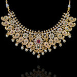 The "Paisley Elegance" polki necklace showcases a harmonious fusion of traditional artistry and modern sophistication. The necklace features a captivating arrangement of paisley motifs, meticulously set with radiant CZ polki diamonds that sparkle like stars.