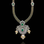 Long Diamond Look Necklace with Emerald Accents and Pearl Drops