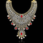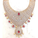 A bejeweled piece beyond compare, this heavy necklace for brides with CZ rubies, pearls and CZ diamonds, captures magnificence.