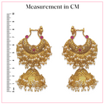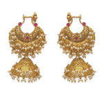 With a cascading arrangement of semi cultured pearls, this temple inspired jhumkas illustrates the intricacies of a honeycomb.