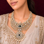 South Indian CZ necklace with floral scrollwork, emerald-look centre and pearl-drop pendant, handcrafted in 92.5 silver with rich gold polish for weddings.