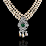 Pearl Necklace with Elegant CZ Diamond & Emerald Pendant