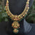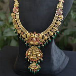 Pure silver gold plated bridal haram with an ornate temple pendant, rich detailing, and green bead drops, finished to shine beautifully.