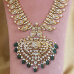 This Pure Silver Gold Plated Mango Haram features a classic mango motif brought to life with finely set CZ stones and graceful green bead drops.