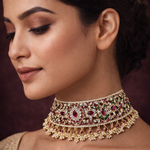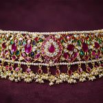 This traditional choker is a celebration of classic South Indian artistry, brought to life through rich ruby and emerald tones set in an intricate polki-inspired pattern.